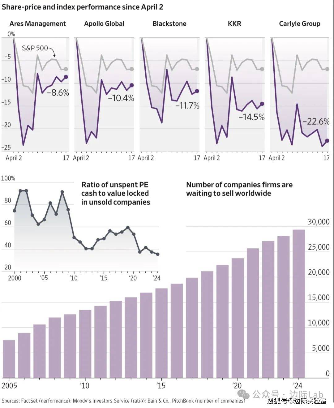 6。自4月初以来,几家大型私募股权公司股价大幅下跌,Carlyle Group下跌超22%,KKR跌幅也达14。5%,远超同期标普500指数的跌幅。这反映出市场对私募基金行业前景的担心正正在加剧。目前私募机构面对“双沉窘境”:一方面,手中尚未退出的投资项目数量创下新高,全球待售公司数量接近3万家,总估值达3。6万亿美元;另一方面,持有的“干粉”(未利用的现金)相对于资产规模创下汗青新低。这导致机构难以兑现报答、分红减缓,客户如养老基金取捐赠基金因回款迟畅而削减新投资,募资也呈现萎缩。